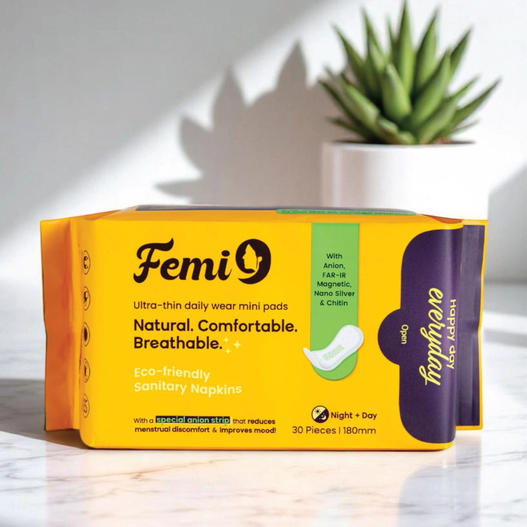Experience all-day comfort and superior protection with Femi9 Ultra-Thin Daily Wear Mini Pads. These eco-friendly pads feature advanced material technology including anion, far-infrared, nano silver, and chitin, making them not only comfortable but also hygienic and effective in enhancing your wellbeing during menstrual periods.
